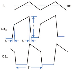 在頻域內(nèi)測(cè)量輻射和傳導(dǎo)電磁干擾,這就是對(duì)已知波形做傅里葉級(jí)數(shù)展開(kāi),本文中我們著重考慮輻射電磁干擾性能。在同步降壓轉(zhuǎn)換器中,引起電磁干擾的主要開(kāi)關(guān)波形是由Q1和Q2產(chǎn)生的,也就是每個(gè)場(chǎng)效應(yīng)管在其各自導(dǎo)通周期內(nèi)從漏極到源極的電流di/dt。圖2所示的電流波形(Q1on和Q2on)不是很規(guī)則的梯形,但是我們的操作自由度也就更大,因?yàn)閷?dǎo)體電流的過(guò)渡相對(duì)較慢,所以可以應(yīng)用HenryOtt經(jīng)典著作《電子系統(tǒng)中的噪聲降低技術(shù)》中的公式1。我們發(fā)現(xiàn),對(duì)于一個(gè)類(lèi)似的波形,其上升和下降時(shí)間會(huì)直接影響諧波振幅或傅里葉系數(shù)(In)。