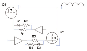 諧波系列的電磁干擾幅度受Q1和Q2的通斷影響。在測(cè)量漏源電壓VDS的上升時(shí)間tr和下降時(shí)間tf,或流經(jīng)Q1和Q2的電流上升率di/dt時(shí),可以很明顯看到這一點(diǎn)。這也表示,我們可以很簡(jiǎn)單地通過(guò)減緩Q1或Q2的通斷速度來(lái)降低電磁干擾水平。事實(shí)正是如此,延長(zhǎng)開(kāi)關(guān)時(shí)間的確對(duì)頻率高于f=1/πtr的諧波有很大影響。不過(guò),此時(shí)必須在增加散熱和降低損耗間進(jìn)行折中。盡管如此,對(duì)這些參數(shù)加以控制仍是一個(gè)好方法,它有助于在電磁干擾和熱性能間取得平衡。具體可以通過(guò)增加一個(gè)小阻值電阻(通常小于5Ω)實(shí)現(xiàn),該電阻與Q1和Q2的柵極串聯(lián)即可控制tr和tf,你也可以給柵極電阻串聯(lián)一個(gè)"關(guān)斷二極管"來(lái)獨(dú)立控制過(guò)渡時(shí)間tr或tf(見(jiàn)圖3)。這其實(shí)是一個(gè)迭代過(guò)程,甚至連經(jīng)驗(yàn)最豐富的電源設(shè)計(jì)人員都使用這種方法。我們的最終目標(biāo)是通過(guò)放慢晶體管的通斷速度,使電磁干擾降低至可接受的水平,同時(shí)保證其溫度足夠低以確保穩(wěn)定性。