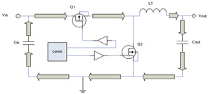 此概念可以推廣到所有利用梯形波形進(jìn)行電路設(shè)計(jì)的場(chǎng)合,不過(guò)本文僅討論電源設(shè)計(jì)。參考圖4中的交流模型,研究其回路電流流動(dòng)情況:起點(diǎn)為輸入電容器,然后在Q1導(dǎo)通期間流向Q1,再通過(guò)L1進(jìn)入輸出電容器,最后返回輸入電容器中。