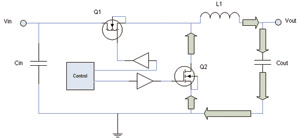 當(dāng)Q1關(guān)斷、Q2導(dǎo)通時(shí),就形成了第二個(gè)回路。之后存儲(chǔ)在L1內(nèi)的能量流經(jīng)輸出電容器和Q2,如圖5所示。這些回路面積控制對(duì)于降低電磁干擾是很重要的,在PCB走線布線時(shí)就要預(yù)先考慮清器件的布局問(wèn)題。當(dāng)然,回路面積能做到多小也是有實(shí)際限制的。