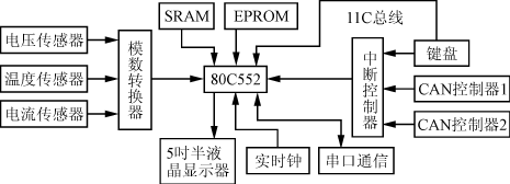 系統(tǒng)的主要功能包括數(shù)據(jù)采集、電量估計(jì)及顯示診斷等。由于80C552具有8路10位A/D轉(zhuǎn)換的功能,因此,采集模塊先采用線性光耦法測量單電池的電壓,通過其4個(gè)A/D口將模擬量轉(zhuǎn)換為數(shù)字量存入存儲器,溫度測量采用單總線技術(shù),使用Dallas數(shù)字芯片來測量溫度,該芯片具有12位的精度等級,能非常準(zhǔn)確地測量到系統(tǒng)的溫度??傠妷骸㈦娏餍盘柾ㄟ^特殊的傳感器將其信號轉(zhuǎn)換為0~10V的信號,通過14位的A/D轉(zhuǎn)換器件轉(zhuǎn)換為數(shù)字量存入系統(tǒng)。