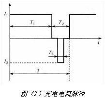快速充電器根據(jù)實(shí)時(shí)檢測到的電池組的端電壓、充電電流、溫度、動態(tài)內(nèi)阻等信息,按照馬斯充電定律,通過采用智能控制算法實(shí)施對充電電流脈沖寬度T1、間歇時(shí)間T2、放電電流脈沖T3的分段調(diào)節(jié),以消除被充電電池組的電極化現(xiàn)象,使電池組時(shí)刻處于較佳的電流接受狀態(tài),提高充電速度和充電效率。具體控制過程是,首先用較寬的充電脈沖進(jìn)行充電,蓄電池的端電壓上升,當(dāng)?shù)竭_(dá)充電時(shí)間T1時(shí),充電器暫停充電,當(dāng)充電間歇時(shí)間達(dá)到T2時(shí)充電器繼續(xù)充電,如此反復(fù),如圖(2)所示。