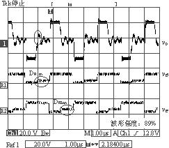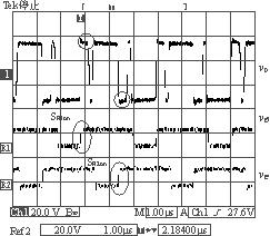 IM-CDR結(jié)構(gòu)選擇如圖1(c)所示的拓?fù)?。從結(jié)構(gòu)上可以看出,磁芯的3個(gè)磁柱上都加了相同的氣隙(lg),這必然會(huì)導(dǎo)致變壓器原邊的漏感(Lk)的增大,但可以利用變壓器原邊漏感中的能量實(shí)現(xiàn)副邊同步整流管的自驅(qū)動(dòng)(開(kāi)通),同步管的關(guān)斷是通過(guò)外加驅(qū)動(dòng)信號(hào)來(lái)完成的。實(shí)驗(yàn)電路如圖2所示,由圖2可以看到副邊同步管的驅(qū)動(dòng)電路包括一個(gè)繞組(Na),兩個(gè)二極管(Da1,Da2)和兩個(gè)MOS管(Sa1,Sa2),它的實(shí)現(xiàn)比較簡(jiǎn)單,只需要在磁芯的中心磁柱上多加一組繞組即可。變壓器原邊采用的是對(duì)稱半橋拓?fù)?。?shí)驗(yàn)電路的具體參數(shù)見(jiàn)表1所列。實(shí)驗(yàn)波形圖如圖3和圖4所示。圖3是在負(fù)載電流Io=4A時(shí)測(cè)得的變壓器原邊電壓波形以及兩個(gè)同步整流管的門(mén)極驅(qū)動(dòng)電壓波形圖。由于此時(shí)的負(fù)載電流較小,反映到變壓器原邊的激磁電流也較小,在原邊開(kāi)關(guān)管關(guān)斷的瞬間,變壓器原邊漏感(Lk)與開(kāi)關(guān)管輸出結(jié)電容(Co1,Co2)間的振蕩尖峰不夠高,不足以開(kāi)通副邊的同步整流管。