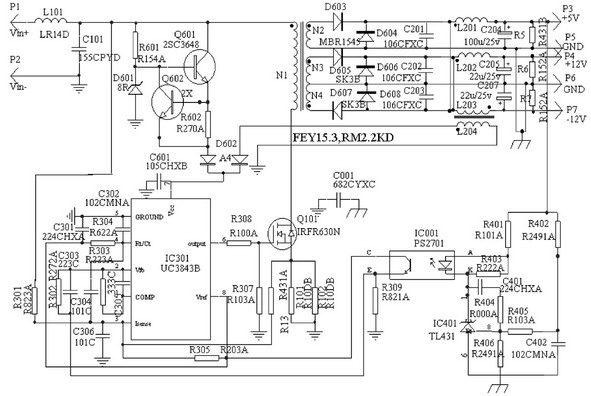 電源工作原理為:電路采用單端正激變換電路,當(dāng)變換器接通電源時(shí),輸入直流電壓經(jīng)由電阻、12V穩(wěn)壓管D601和三極管Q601、Q602組成的電路穩(wěn)壓降壓后, 啟動(dòng)UC3843進(jìn)入正常工作,偏置繞組L204的供電電路開始工作,輸出經(jīng)A4和C601整流及濾波后輸出12V電壓,高于自供電電壓,使二極管A4反偏,啟動(dòng)電路停止工作。變換器進(jìn)入正常工作后,電源依據(jù)PWM脈寬調(diào)制方式工作,次級繞組的輸出經(jīng)過二極管整流以及電容器和電感器組成的LC型濾波器濾波后,產(chǎn)生所需的各路輸出直流電壓。+5V的輸出電壓由電阻器R402和R406分壓后,與可編程穩(wěn)壓源TL431(U3)中的2.5V參考電壓比較,然后通過光耦合器U2反饋到UC3843的2腳,控制脈沖的占空比,穩(wěn)定5V輸出。耦合電感L202和L203實(shí)現(xiàn)+/-12V兩路穩(wěn)壓。過流保護(hù)電阻R101、R102檢測到開關(guān)管的過流信號,送入3843的3腳,封鎖UC3843的輸出信號,實(shí)現(xiàn)過流保護(hù)。