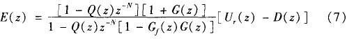 Q(z)、Gf(z)為低通濾波補(bǔ)償器,是重復(fù)控制器設(shè)計工作的重點。P(z)的作用是將開環(huán)增益調(diào)節(jié)至很大的有限值,在不影響穩(wěn)態(tài)精度的前提下保證系統(tǒng)穩(wěn)定性;Gc(z)的作用是通過限制重復(fù)控制器的頻帶范圍來提高系統(tǒng)的魯棒性 。由圖可得到系統(tǒng)的誤差傳遞函數(shù)為: