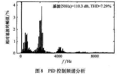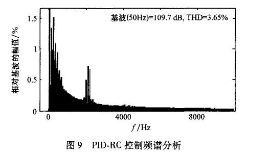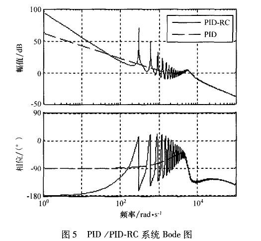 在高頻段,開環(huán)增益變得非常小,這對抑制高頻噪聲,提高系統(tǒng)穩(wěn)定性和魯棒性是非常有幫助的。但是,在非諧波頻率處,沒有嵌入重復(fù)控制器的系統(tǒng)開環(huán)增益更大一些,這說明重復(fù)控制器對位于該頻率的信號控制效果較差。因此,PID控制器在系統(tǒng)中除了有提高系統(tǒng)動態(tài)響應(yīng)速度的作用外,還要調(diào)節(jié)非諧波信號,彌補(bǔ)重復(fù)控制器的不足。