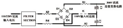 浪涌電流的抑制方法有很多,一般中小功率電源中采用電阻限流的辦法抑制開機(jī)浪涌電流。圖2是一個(gè)常見的110V/220V雙輸入電源示意圖,以此為例,我們分析一下如何使用NTC熱敏電阻進(jìn)行浪涌電流的抑制。
