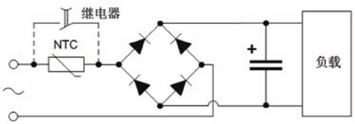 假設(shè)輸入電壓V1為220Vac,整個(gè)電網(wǎng)內(nèi)阻(含整流橋和濾波電容)Rs=1Ω,若正好在電源輸入波形達(dá)到90度相位的時(shí)候開機(jī),那么開機(jī)瞬間浪涌電流的峰值將達(dá)到I=220×1.414/1=311(A)。這個(gè)浪涌電流雖然時(shí)間很短,但如果不加以抑制,會(huì)減短輸入電容和整流橋的壽命,還可能造成輸入電源電壓的降低,讓使用同一輸入電源的其它動(dòng)力設(shè)備瞬間掉電,對臨近設(shè)備的正常工作產(chǎn)生干擾。