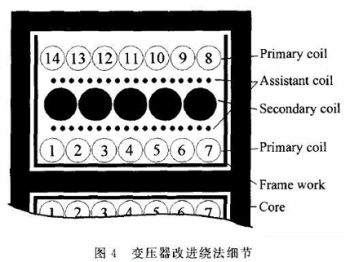 本文討論的電路中還存在前級電路和次級電路的輔助電源,它們也是由繞在變壓器上的獨立線圈提供能量的。這兩級輔助線圈的存在給噪聲電流的傳播提供了額外的途徑。輔助線圈是為了控制電路的供電設計的。盡管控制電路本身的功率很小,但它們的存在卻增大了電路對地的寄生電容,從而分擔了一部分把共模噪聲從活躍節(jié)點耦合到地的工作。然而把這些繞組夾在前級線圈和次級線圈的繞組中間就能增大前后級繞組的距離,從而它們的層間寄生電容就減小了,噪聲電流就能相應減小。因此,變壓器繞制的最終方法應如圖4所示。從內(nèi)到外的線圈繞組依次是:前級繞組的一半、輔助繞組的一半、后級繞組、輔助繞組的另一半和前級繞組的另一半。