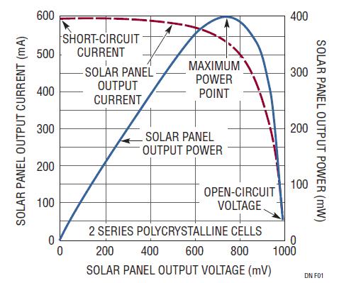 雖然太陽能電池或太陽能電池板是按照功率輸出來分類,但電池板的可用功率卻很少是恒定的。其輸出功率在很大程度上取決于光照、溫度以及從電池板吸收的負(fù)載電流。為說明這一點,圖 1 示出了一塊雙電池太陽能板在恒定光照條件下的 V-I 特性曲線。I-V 曲線在短路 (最左側(cè)) 至大約 550mA 負(fù)載電流的范圍內(nèi)具有相對恒定的電流特性,隨之在較低的電流條件下它遵從于恒定電壓特性,并在開路時 (最右側(cè)) 趨近于最大電壓。電池板的功率輸出曲線顯示:功率輸出在大約 750mV/530mA 的地方 (I-V 曲線的拐點處) 出現(xiàn)一個明顯的峰值。如果負(fù)載電流增至超過功率峰值,則功率曲線迅速下降至零 (最左側(cè))。同樣,輕負(fù)載也會使功率趨向于零 (最右側(cè)),不過這往往不太會是一個問題。
