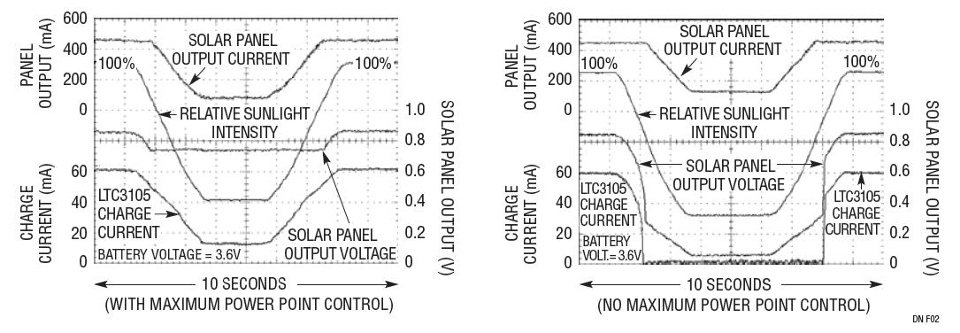 圖 2 示出了在采用和未采用最大功率點控制的情況下,陽光的變化對于充電電流的影響。模擬陽光的強度從 100% 降至約 20%,而后回升至 100%。請注意,當(dāng)陽光強度下降至 20% 左右時,太陽能板的輸出電壓和電流也下降,但是 LTC®3105 的最大功率點控制則可以防止太陽能板的輸出電壓降至 750mV 的設(shè)定值以下。它通過減小 LTC3105 的輸出充電電流以防止太陽能板電壓驟降至接近 0V 來實現(xiàn)上述功能,如圖 2 中右側(cè)的曲線圖所示。而在未采用功率點控制時,陽光強度的小幅下降也會完全阻斷充電電流的流動。