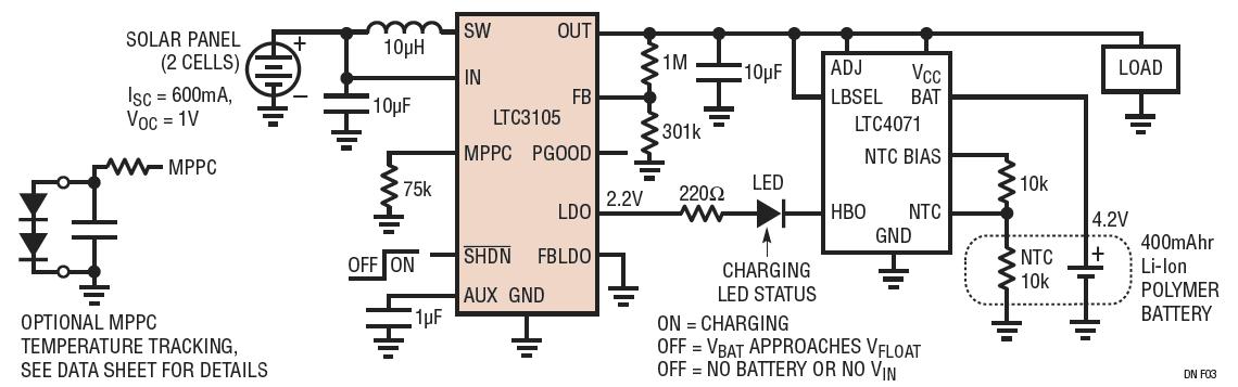雖然本文描述的電路僅可產(chǎn)生幾百 mW 的功率,但它卻能夠在大多數(shù)天氣條件下提供足以使一個 400mAhr 鋰離子電池保持滿充電狀態(tài)的功率。低輸入電壓與輸入功率控制相結(jié)合,使得 LTC3105 成為低功率太陽能應(yīng)用的理想選擇。此外,LTC4071 并聯(lián)充電系統(tǒng)還通過提供精準(zhǔn)浮置電壓、充電狀態(tài)和溫度安全特性而對 LTC3105 給予了補充,可在室外環(huán)境中確保長久的電池使用壽命。