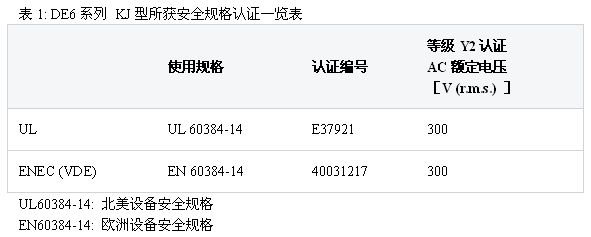 要想獲得安全規(guī)格認(rèn)證,需要接受規(guī)定的實(shí)驗(yàn)并滿足要求標(biāo)準(zhǔn),通過合格判定,才能夠證明電容器符合該規(guī)格。但目前,對(duì)On-Board(含車載充電器的車載設(shè)備)的安全規(guī)格并無(wú)明確規(guī)定。實(shí)際上,車載充電器已經(jīng)參照現(xiàn)有民用設(shè)備的安全規(guī)格,決定了其規(guī)格發(fā)展方向并付諸實(shí)施。因此,該電容器在遵循現(xiàn)有的設(shè)備安全規(guī)格(IEC 60384-4)的基礎(chǔ)上,也獲得了各國(guó)的安全規(guī)格認(rèn)證。DE6系列“KJ”型所獲得的安全規(guī)格認(rèn)證如下表1所示。