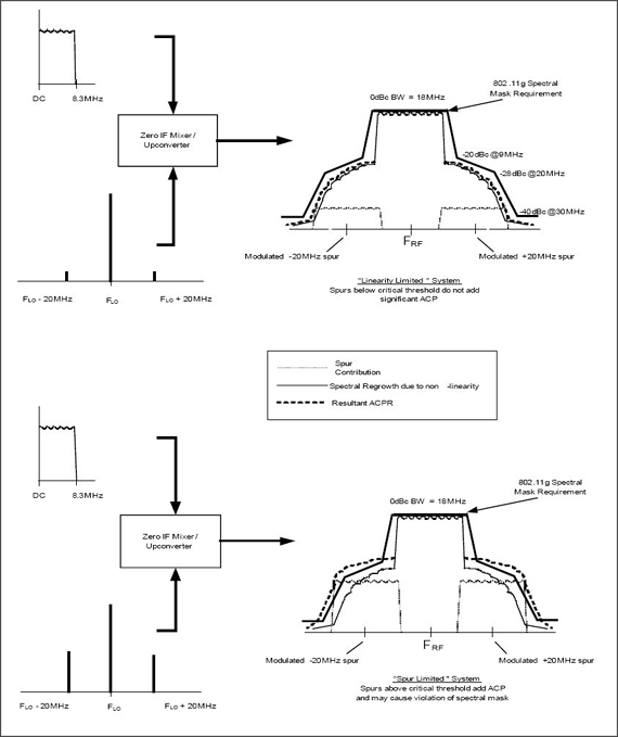 滿足802.11a/b/g系統(tǒng)發(fā)送頻譜模板的要求是設(shè)計(jì)過(guò)程中的一個(gè)難點(diǎn),必須對(duì)線性指標(biāo)和功耗進(jìn)行平衡,并留出一定裕量,確保在維持足夠的發(fā)射功率的前提下符合IEEE和FCC規(guī)范。IEEE802.11g系統(tǒng)在天線端所要求的典型輸出功率為+15dBm,頻率偏差20MHz時(shí)為-28dBr。頻帶內(nèi)相鄰信道的功率抑制比(ACPR)是器件線性特性的函數(shù),這在一定前提下、對(duì)于特定的應(yīng)用是正確的。在發(fā)送通道優(yōu)化ACPR特性的大量工作是憑借經(jīng)驗(yàn)對(duì)TxIC和PA的偏置進(jìn)行調(diào)節(jié),并對(duì)PA的輸入級(jí)、輸出級(jí)和中間級(jí)的匹配網(wǎng)絡(luò)進(jìn)行調(diào)諧實(shí)現(xiàn)的。