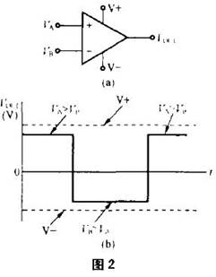 圖2(a)是雙電源(正負(fù)電源)供電的比較器。如果它的VA、VB輸入電壓如圖1(b)那樣,它的輸出特性如圖2(b)所示。VB》VA時(shí),Vout輸出飽和負(fù)電壓。