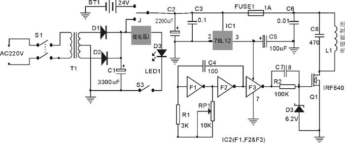 經(jīng)繼電器J選擇的+24V直流電主要為發(fā)射線圈L1供電,此外,經(jīng)IC1(78L12)降壓后為集成電路IC2供電,為保證J的動(dòng)作不影響發(fā)送電路的穩(wěn)定工作,電容C3的容量不得小于2200uF。