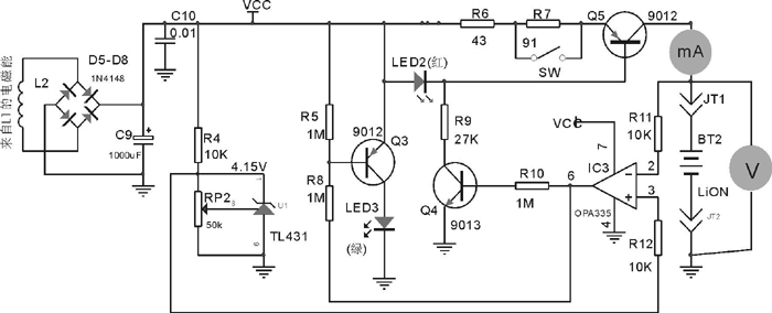 由R4,RP2和TL431構(gòu)成精密參考電壓4.15V(鋰離子電池的充電終止電壓)經(jīng)R12接到運(yùn)放IC的同相輸入端3。當(dāng)IC2的反相輸入端2低于4.15V時(shí)(充電過(guò)程中),IC3輸出的高電位一方面使Q4飽和從而在LED2兩端得到約2V的穩(wěn)定電壓(LED的正向?qū)ň哂蟹€(wěn)壓特性),Q5與R6、R7便據(jù)此構(gòu)成恒流電路I0=2-0.7R6+R7。另一方面R5使Q3截止,LED3不亮。