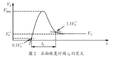 由整流二極管的國(guó)際標(biāo)準(zhǔn)知,正向恢復(fù)時(shí)間tfr 規(guī)定為:在緊接零電壓或其他規(guī)定的反向電壓條件施加規(guī)定的階躍正向電流時(shí),正向電壓上升到第一個(gè)規(guī)定值瞬間和從其峰值VFRM 下降到接近正向電壓最終穩(wěn)定值的第二個(gè)規(guī)定值瞬間的時(shí)間間隔。如圖2 所示。
