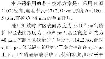 本課題采用的技術(shù)方案是在電焊機(jī)專用大電流密度整流二極管的科研成果[4]的基礎(chǔ)上,如單晶的選取、擴(kuò)散方法和技術(shù)要求、多層金屬化的歐姆接觸、臺(tái)面噴砂造型和聚酰亞胺鈍化保護(hù)、管殼設(shè)計(jì)等大都是直接借用過(guò)來(lái)的,并且是經(jīng)過(guò)改進(jìn)的方案研制的,所以使整個(gè)研制工作走了捷徑。