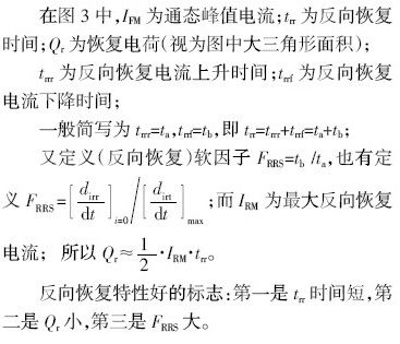 由整流二極管的國(guó)際標(biāo)準(zhǔn)知,反向恢復(fù)時(shí)間trr規(guī)定為:當(dāng)從正向到反向轉(zhuǎn)換時(shí),從電流過(guò)零瞬間起,至反向電流由峰值IFM減少到規(guī)定低值瞬間(如圖3 所示)的時(shí)間間隔。