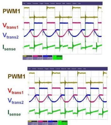 圖2所示為一個(gè)雙相交錯(cuò)式雙開關(guān)正向轉(zhuǎn)換器的實(shí)驗(yàn)波形,本例采用ADI公司的數(shù)字控制器ADP1043實(shí)施控制。當(dāng)總負(fù)載電流降至某一閾值以下時(shí),第二相位禁用。如圖3所示,當(dāng)一個(gè)相位關(guān)斷時(shí),輕載效率得到提高。實(shí)施和不實(shí)施相位優(yōu)化控制的輕載效率差可能高達(dá)15%。