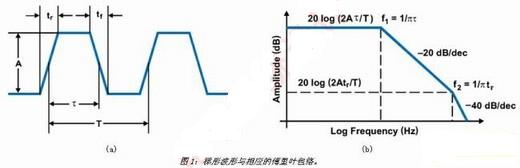 對(duì)于CCM中運(yùn)作的降壓轉(zhuǎn)換器,電感電流一直是非零的正電流。在這種情況下,負(fù)載周期為D=Vout/Vin,在本例中為38%(5V/14V)。使用200kHz的開(kāi)關(guān)頻率時(shí),我們很快計(jì)算出導(dǎo)通時(shí)間為1.8μs。為支持此頻率,控制開(kāi)關(guān)的上升/下降時(shí)間必須小于90納秒。這使得我們注意到第一個(gè)減少噪聲的方法,也就是斜率控制。您可能還無(wú)法理解,但是此時(shí)我們非常了解與PWM切換節(jié)點(diǎn)有關(guān)的諧波,也就是開(kāi)關(guān)穩(wěn)壓器的控制波形。如果將此波形以圖1(a)中所示的梯形表示,波形的諧波便能夠以圖1(b)中的內(nèi)容表示,這表明了EMI背后的驅(qū)動(dòng)因素。這一傅里葉包絡(luò)定義了可通過(guò)傅里葉分析或計(jì)算梯形波形導(dǎo)通時(shí)間及上升時(shí)間取得的諧波振幅。