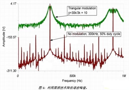 最后,本文將探討另一項(xiàng)越來(lái)越受到廣泛使用的技術(shù),能夠?qū)⒎逯抵C波能量散布于較大的頻帶,以有效降低該能量。該技術(shù)被稱為展頻頻率抖動(dòng)(SSFD),能夠通過(guò)諧波峰值的降低將噪聲信號(hào)從窄頻變成寬頻,以改變?cè)肼曨l譜。其中必須了解能量頻譜的變化,而整個(gè)能量則維持不變。最終的結(jié)果是噪聲水平一般會(huì)增加,從而損害高保真系統(tǒng)。圖4顯示發(fā)生的諧波擴(kuò)散及峰值降低。一般降低的幅度為5至10dB,后續(xù)的諧波會(huì)增加峰值降低的幅度。