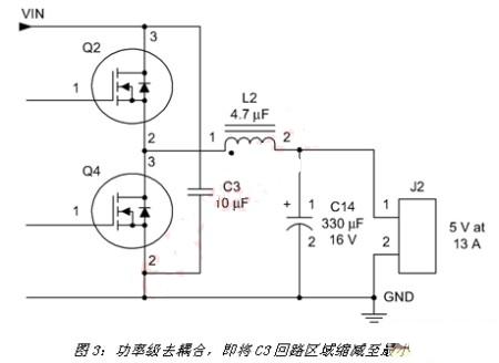 在一個(gè)電源的正確配置中,必須將大電流導(dǎo)體的回路部分縮減至最小。這樣做能夠?qū)⒆鳛樘炀€源和發(fā)射能量的電感降至最低。其中一個(gè)層面是有效放置元件及選用去耦電容。圖3顯示同步降壓轉(zhuǎn)換器的輸出功率級(jí)與濾波器。C3將功率級(jí)去耦合,以便在Q2啟動(dòng)時(shí)提供低阻抗源。為了將輻射發(fā)射量降至最低,必須如圖所示連接C3,其中電容的固有阻抗、電路信號(hào)線及通過(guò)電感的互連均縮減至最小。另外,也需要具有諸如X7R等高自振頻率的高品質(zhì)電容電介質(zhì)。