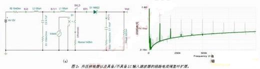 只要加入L2及C2,波形便會(huì)變成正弦曲線,而能量會(huì)重新調(diào)整為相當(dāng)?shù)偷母哳l率峰值。不過(guò),如果不能正確設(shè)計(jì)輸入濾波器,則會(huì)將噪聲放大而使得控制回路不穩(wěn)定。因此,了解濾波器設(shè)計(jì)的概念,對(duì)于優(yōu)化濾波器回波及成本相當(dāng)重要。使用SPICE的AC分析是有效了解濾波器行為的工具。