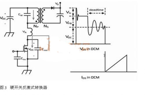 圖3示出傳統(tǒng)硬開關(guān)反激式轉(zhuǎn)換器。在這種傳統(tǒng)的間斷模式反激式轉(zhuǎn)換器 (DCM) 的停滯時間期間,寄生電容將與VDC周圍的主要電感發(fā)生振蕩。寄生電容上的電壓會隨振蕩而變化,但始終具有相當(dāng)大的數(shù)值。當(dāng)下一個時鐘周期的MOSFET 導(dǎo)通時間開始時,寄生電容 (COSS和CW) 會通過MOSFET放電,產(chǎn)生很大的電流尖峰。由于這個電流出現(xiàn)時MOSFET存在一個很大的電壓,該電流尖峰因此會做成開關(guān)損耗。此外,電流尖峰含有大量的諧波含量,從而產(chǎn)生EMI。[page]