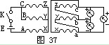 測單相變壓器時,如圖36所示,在初級線圈一側(cè)拉入一個1.5伏的干電池,然后在次級線圈拉入一直流毫伏表。當(dāng)合上開關(guān)K的一瞬間,表針朝正方向擺動(或拉開開關(guān)時表針向負方向擺),說明接電池正極一端是同極性,或叫同名端。測試三相變壓器的極性和級別,多采用直流法進行。測試方法為:在初級線圈側(cè)接上干電池和開關(guān)K,先在A端接電池正極,B端接電池負極,再在次級線圈a、b、c之間拉入三個毫伏表,如圖37所示,