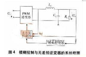 將輸出電壓和濾波電感電流反饋,即電壓誤差和電感電流作為輸入模糊變量,可以實(shí)現(xiàn)逆變器的模糊控制,整流性負(fù)載時,其輸出電壓總諧波失真(total harmonic distortion,TH)小于5%,將模糊控制與無差拍控制相結(jié)合,可用來補(bǔ)償由于非線性負(fù)載導(dǎo)致的電壓降落,其系統(tǒng)如圖4所示。模糊控制從模仿人的思維外特性入手,模仿人的模糊信息處理能力。它對系統(tǒng)的控制是以人的經(jīng)驗(yàn)為依據(jù)的,而人的經(jīng)驗(yàn)正是反映人在思維過程中的判斷、推理、歸納。理論上已經(jīng)證明,模糊控制可以任意精度逼近任何線性函數(shù),但受到當(dāng)前技術(shù)水平的限制,模糊變量的分檔和模糊規(guī)則都受到一定的限制,隸屬函數(shù)的確定還沒有統(tǒng)一的理論指導(dǎo),帶有一定的人為因素,因此,模糊控制的精度有待于進(jìn)一步提高?! ?/p>