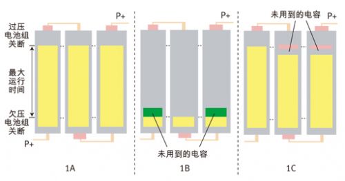 在鋰離子電池組中,存在一些允許每節(jié)串聯(lián)電池達(dá)到的預(yù)定義電壓最小值和最大值。這是一種由電池組中IC控制的安全特性,請(qǐng)參見圖1A。只要每一節(jié)電池均保持在過(guò)壓和欠壓斷開范圍之間,則該電池組便能夠放電和充電。如果一節(jié)電池達(dá)到上述任何一個(gè)閾值,則整個(gè)電池組便會(huì)關(guān)閉(欠壓),從而讓主機(jī)本應(yīng)可用的電池組處于無(wú)法充電狀態(tài)(請(qǐng)參見圖1B)。另外,它不允許充電器向電池組充入應(yīng)有的大量能量(請(qǐng)參見圖1C)(過(guò)壓)。