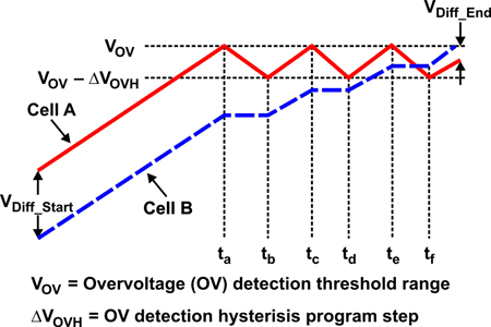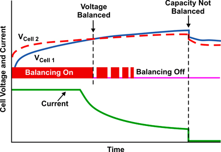 電池平衡算法只使用電壓發(fā)散作為平衡標(biāo)準(zhǔn),具有過(guò)平衡(或欠平衡)的缺點(diǎn),這是由于存在阻抗失衡影響(請(qǐng)參見圖3和圖4)。問(wèn)題是,電池阻抗還會(huì)在充電期間引起電壓差異(VDiff_Start和VDiff_End)。簡(jiǎn)單的電壓電池平衡并未區(qū)分是電量失衡還是阻抗失衡。因此,這種平衡不能保證完全充電后所有電池均獲得100%的電量。