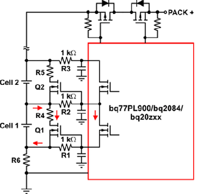 由于使用集成FET解決方案的無(wú)源電池平衡技術(shù)的平衡能力有限,因此電池差異或失衡率可能超過(guò)電池平衡。另外,由于存在低旁路電流,它可能會(huì)占用幾個(gè)周期來(lái)對(duì)一般失衡進(jìn)行校正。利用現(xiàn)有組件設(shè)計(jì)一些外部旁路電路可以增強(qiáng)電池平衡(請(qǐng)參見圖6和圖7)。在圖6中,當(dāng)決定對(duì)某節(jié)電池進(jìn)行平衡時(shí)內(nèi)部平衡MOSFET首先開啟。這便形成一條低電流通路,其通過(guò)連接電池端(電池1和電池2)及IC引腳的外部濾波器電阻。當(dāng)內(nèi)部FET柵-源電壓在電阻中形成,該外部MOSFET便被開啟。其缺點(diǎn)是,鄰近電池?zé)o法快速、同時(shí)獲得平衡。例如,如果鄰近內(nèi)部FET被開啟,則Q2不能被開啟,因?yàn)闆](méi)有通過(guò)R2的電流。
