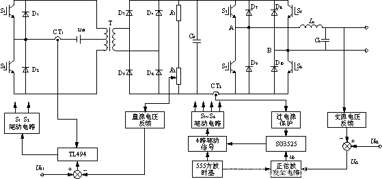 再經(jīng)過全橋DC/AC逆變電路,得到220V/50Hz交流電壓輸出。為保證系統(tǒng)可靠運(yùn)行,防止主電路對控制電路的干擾,采用主、控電路完全隔離的方法,即驅(qū)動(dòng)信號用光耦隔離,反饋信號用變壓器隔離,輔助電源用變壓器隔離等。