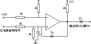 過電流保護(hù)采用電流互感器作為電流檢測元件,其具有足夠快的響應(yīng)速度,能夠在IGBT允許的過流時(shí)間內(nèi)將其關(guān)斷,起到保護(hù)作用。如圖1所示,過流保護(hù)信號取自CT2,經(jīng)分壓、濾波后加至電壓比較器的同相輸入端,如圖4所示。當(dāng)同相輸入端過電流檢測信號比反相輸入端參考電平高時(shí),比較器輸出高電平,使D2從原來的反向偏置狀態(tài)轉(zhuǎn)變?yōu)檎驅(qū)?,并把同相端電位提升為高電平,使電壓比較器一直穩(wěn)定輸出高電平。同時(shí),該過電流信號還送到SG3525的腳10。當(dāng)SG3525的腳10為高電平時(shí),其腳11及腳14上輸出的脈寬調(diào)制脈沖就會立即消失而成為零。