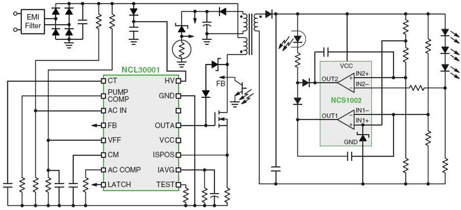 并不是所有的區(qū)域照明應(yīng)用都要求采用分布式/模塊化方案。隨著白光LED性能的快速提升,新型LED已經(jīng)可以配合新的LED驅(qū)動(dòng)器設(shè)計(jì)方法。領(lǐng)先的LED制造商已經(jīng)推出支持更大電流及具備更高發(fā)光性能的新型LED,如Cree的XP-G系列LED(正向壓降為3.3 V)在1 A電流時(shí)可提供330流明光輸出,Seoul Semiconductor的P7系列LED(正向壓降為3.3 V)在1.4 A時(shí)可提供400 流明光輸出。在這種條件下,可以配置新穎的LED驅(qū)動(dòng)器來(lái)直接驅(qū)動(dòng)1 A到3 A的大電流。例如,可以采用安森美半導(dǎo)體的NCL30001功率因數(shù)校正TRIAC可調(diào)光LED驅(qū)動(dòng)器。