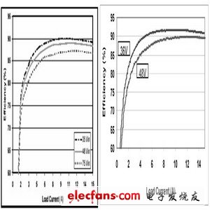 Maxim電源部制作了一款基于MAX5051的隔離電源模塊,圖2是詳細(xì)的電氣原理圖。我們將該電源模塊與市場上流行的電流模式同步整流推挽電源模塊(這里我們稱其為非定制模塊)進(jìn)行了比較,從所測試的效率曲線(圖3)可以看出,基于MAX5051的模塊效率明顯提高。輕載時(shí),比如1A輸出負(fù)載,MAX5051模塊電源的效率大于62%,而非定制模塊的效率則小于58%。在輸出功率為半載時(shí)(7.5A),MAX5051模塊效率為92%,非定制模塊效率是88%。滿功率負(fù)載時(shí),MAX5051模塊電源的效率仍比非定制模塊效率高出4%。從效率曲線對比,可以得出雙管正激電路能夠更好的滿足模塊電源高效率的要求。