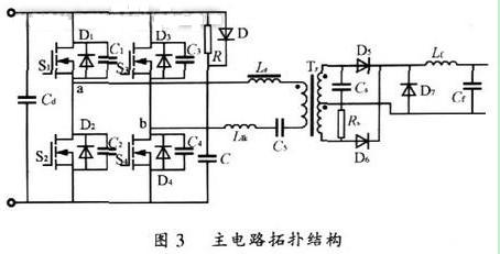本系統(tǒng)所采用的全橋變換器拓撲結(jié)構(gòu)如圖3所示。主電路中選用了MOSFET作為主功率開關器件,這是因為本系統(tǒng)的設計頻率為100 kHz,而與IGBT一般最高工作在幾十kHz相比,MOSFET的工作頻率則要高的多。另外由于MOSFET自身帶有反并聯(lián)二級管和較大的輸出電容,如圖3中D1~D4、C1~C4所示,為軟開關的實現(xiàn)提供了便利條件。變壓器副邊輸出整流結(jié)構(gòu)有全波整流(變壓器副邊三抽頭+兩只二級管)和全橋整流(變壓器副邊兩抽頭+四只二級管)兩種結(jié)構(gòu)可供選擇,前者適合于輸出低壓大電流的場合,后者適合于輸出高壓小電流場合。由于逆變焊機可看作是一個低壓大電流源.因此選用全波整流。