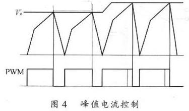 在本方案所采用的峰值電流控制模式下,腳19(RAMP)端的鋸齒波信號是從變壓器原邊的電流信號經(jīng)采樣整流得到的。但由于實際上原邊電流信號波形上升斜率較緩,與給定比較時,容易因為干擾或毛刺抖動產(chǎn)生誤動作。因此實際應用時,先將原邊電流的采樣整流值與芯片定時電容CT上的鋸齒波相疊加,經(jīng)過斜坡補償后,再送入腳19(RAMP)端進行比較控制。峰值電流控制過程如圖4所示。