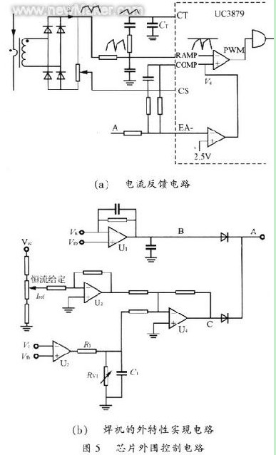 (2)外拖特性實現(xiàn) 正常工作時,輸出電壓反饋值Vfb大于外拖給定值Vz,比較器U3的輸出為零,對加法器U4沒有影響,焊接電流由恒流給定值Iref決定;當焊槍與工件粘連短路時,Vfb小于VZ,比較器U3的輸出為高,相當于給增大了Iref,UC3879內(nèi)部誤差放大器的輸出Ve也增大,焊接電流則隨之增大,從而實現(xiàn)外拖。