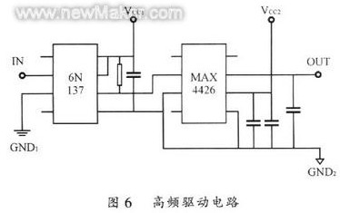 其中IN接自來于UC3879的輸出脈沖信號,CND1接控制電路地信號,GND2接被驅(qū)動MOS-FET的源極。6N137是一個高速光耦,傳輸延遲時間僅有40 ns。從控制電路來的信號經(jīng)過光耦隔離后送至驅(qū)動電路,使得控制電路和驅(qū)動電路有較好的電氣隔離,消除對控制電路的十擾。MAX4426是一個專門用于M0SFET的高頻驅(qū)動芯片,其內(nèi)部有兩個驅(qū)動電路,可以很容易地并聯(lián)以提供較大的輸出功率。典型上升、下降時間僅為20ns,延遲時間小大于40ns,可工作于1MHz,提供1.5A的峰值輸出電流。