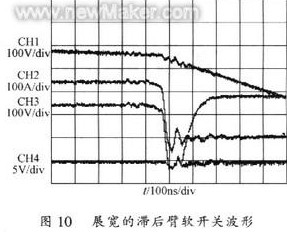 其中通道l和通道2分別為原邊電流、電壓波形;通道3為滯后臂管壓降,通道4為其驅(qū)動波形。圖10是圖9的局部展寬波形。從中可以明顯地看到當滯后臂管壓降已經(jīng)諧振到零后,驅(qū)動脈沖才由低變到高,使其在零電壓下導通,實現(xiàn)軟開關。