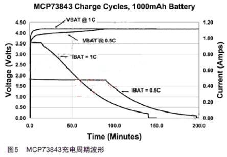 利用MCP73843在1C和0.5C恒流充電速率下的整個(gè)充電周期如圖5.以0.5C而不是1C速率充電時(shí),充電結(jié)束的時(shí)間大約晚了一個(gè)小時(shí)。充電終止電流從0.07C降到0.035C,使得最終電池容量從~98%增長(zhǎng)到~100%.系統(tǒng)設(shè)計(jì)師必須在充電時(shí)間、功率損耗和可用電池容量之間進(jìn)行權(quán)衡。