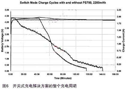 利用開關(guān)式充電解決方案的整個(gè)充電周期如圖6所示。通過在充電系統(tǒng)中采用電池監(jiān)控器,可以大大縮短充電周期,使用電池監(jiān)控器就不必再檢測(cè)電池包保護(hù)電路兩端的電壓以及充電電流的接觸電阻。