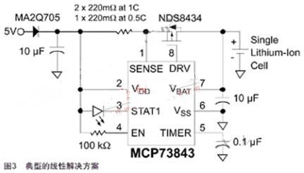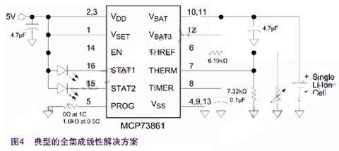 基于Microchip MCP73861的全集成線性解決方案如圖4所示。MCP73861包含了MCP73843的所有功能,另外還包括電流檢測(cè)、傳輸晶體管、反向放電保護(hù)以及電池溫度監(jiān)測(cè)。