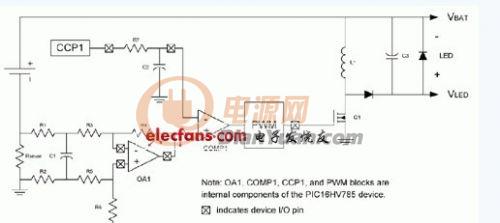 然后,應用程序代碼可以測量供電電壓(利用片上集成的10位A/D轉換器)和供電電流,從而保證驅動LED工作在恒定功率模式。隨著電池輸入電壓的變化,D/A電路(采用CCP外設實現(xiàn))將產生新的參考電壓值進行補償。