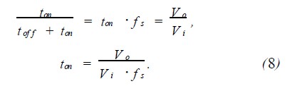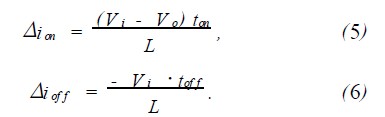 可以認(rèn)為Δi就是電感線圈中的紋波電流,將導(dǎo)通和關(guān)斷狀態(tài)時(shí)的時(shí)間和電壓式(2)和式(3)代入上式,分別寫(xiě)出導(dǎo)通狀態(tài)和關(guān)斷狀態(tài)時(shí)的紋波電流表達(dá)式: