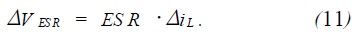 計(jì)算第二部分,對(duì)于一般電容,都具有串聯(lián)等效電感和串聯(lián)等效電阻(其實(shí)還有并聯(lián)等效絕緣電阻)。串聯(lián)等效電感只在較高頻率時(shí)起作用,在分析開(kāi)關(guān)頻率時(shí)可以將其忽略,但必須考慮的是串聯(lián)等效電阻ESR.電流ΔiC流過(guò)ESR時(shí),會(huì)在ESR兩端產(chǎn)生電壓降,其值為: